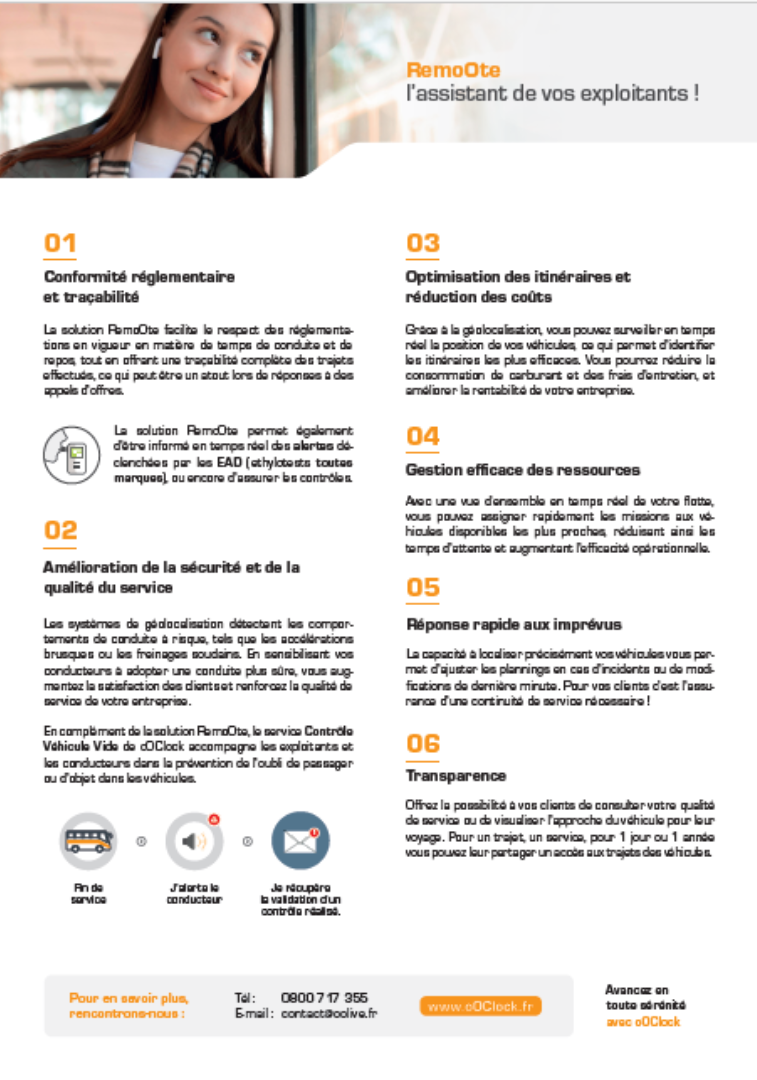 La solution remoOte oOClock est l’outil du quotidien de l’exploitant ou gestionnaire de flotte de véhicules. Il permet de géolocaliser les véhicules, remonte les données métier et accompagne au respect des obligations. La solution RemoOte facilite le respect des réglementations en vigueur en matière de temps de conduite et de repos , tout en offrant une traçabilité complète des trajets effectués.